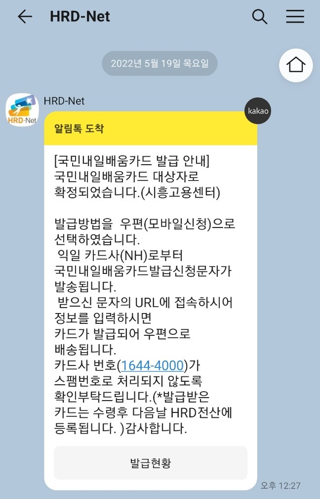 그리고 저는 NH농협 체크카드로 신청을 했더니 HRD-Net에서 카톡이 왔고, 그 다음날 NH농협에서 문자로 카드 발급 url이 와서 모바일로 신청을 했습니다. 카드 수령까지는 약 일주일 정도 소요되었습니다.
